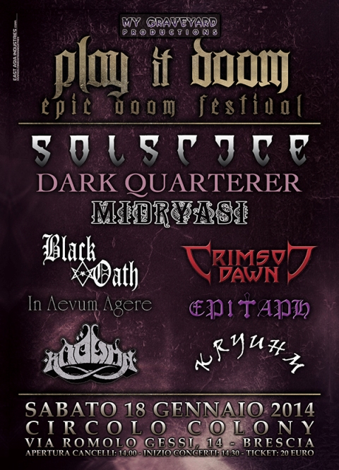 L’occasione è di quelle ghiotte: al Circolo Colony di Brescia va in scena il Play It Doom, festival dedicato al suono del destino. Il Colony – un passato da night club alle spalle – si presenta con un arredamento molto 80’s fatto di look demodè e luci soffuse, come dire: che lo show abbia inizio. Non prima di menzionare Giuliano Mazzardi della My Graveyard Production, che da anni si prodiga per supportare, organizzare e tenere in vita l’interesse verso una musica che lui stesso ama per primo.