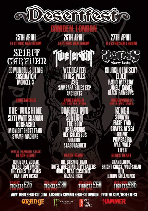 Il report dell’edizione londinese del DesertFest 2014 non è così semplice da scrivere, per me. Un po’ per via dell’accumulo di musica dovuto alla stagione – che si è aperta da poche settimane, ma mi ha già visto spettatrice di un paio di situazioni epiche, a metà tra il sacro e il profano – un po’ perché sinceramente la situazione da descrivere è completamente diversa da quella berlinese, che ho conosciuto l’anno scorso. Ingenua, non me l’aspettavo, anche se “Londra, grande evento e rock’n’roll” sono parole che non vanno più a braccetto armonicamente da diversi anni. Con questo non voglio dire che il festival sia stato brutto e/o noioso, tutt’altro. È il modo di fare anglosassone che un po’ ci tarpa le ali… Un po’ ci spacca i maroni, ecco. Il dilemma per me è cominciato all’aeroporto di Stansted, dove ho fatto una fila chilometrica per effettuare il controllo documenti. Io, cittadina UE. Sorvoliamo e andiamo subito al dunque: mi serve dividere il report in livelli, per non confondermi e non confondere. Partiamo dalle location.